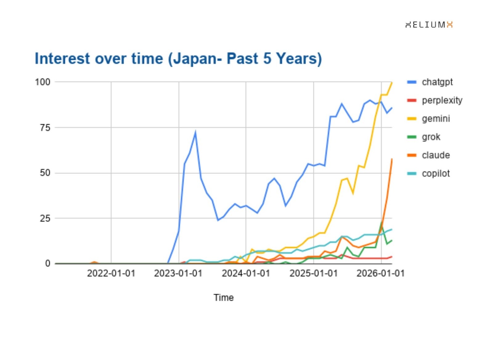 Across most APAC markets, ChatGPT continues to lead the LLM category, accounting for an estimated 70–80% of market share in terms of awareness, usage, and category dominance. It remains the primary entry point for AI adoption in both consumer and professional use cases.